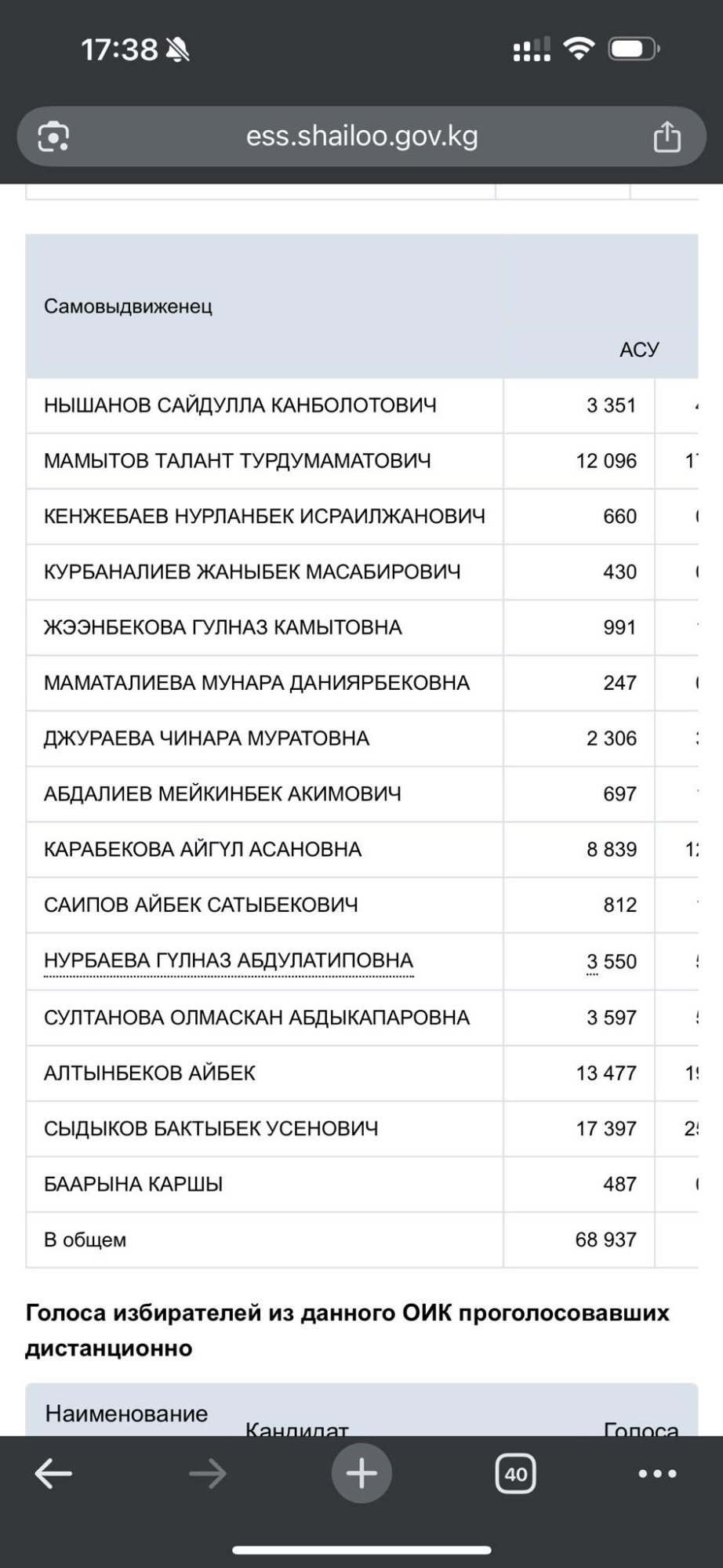 Напомним, Бакыт Сыдыков набрал в этом округе, по предварительным данным ЦИК, 17 тысяч 397 голосов, за ним идет Айбек Алтынбеков с 13 тысячами 477 голосами.